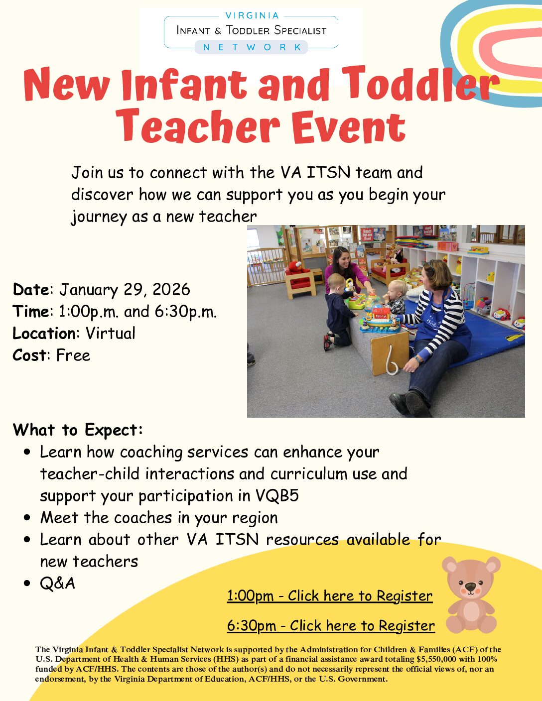 Are you ready to enhance teacher-child interactions and optimize your curriculum implementation? Our specialized VA ITSN coaching services are designed specifically for infant and toddler classrooms and directors, offering flexible, responsive support that aligns with your classroom’s unique needs and goals.